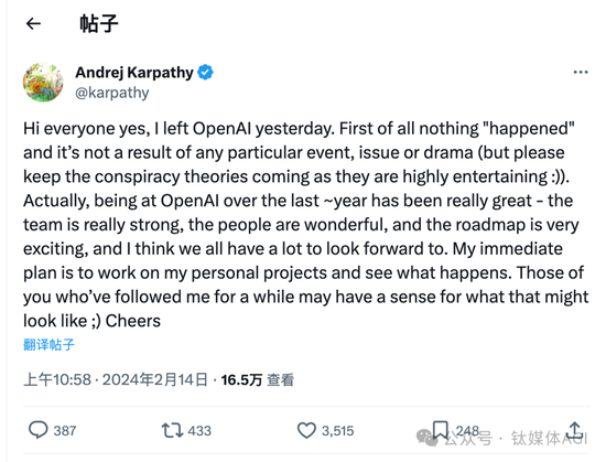 随后,卡帕蒂在社交平台X上证实了此事,并表示昨天他就已离开OpenAI,但没有“发生”任何不愉快的事情。卡帕蒂透露,接下来他将开展一个个人项目。