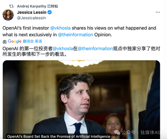 事实上,去年11月,OpenAI CEO奥尔特曼(Sam Altman)被OpenAI 非营利母公司董事会罢免后,多名技术人员离职。然而,董事会改变决定后,这些员工与奥尔特曼一起回到了公司。当时,卡帕蒂转发了一条The Information报道推文——OpenAI董事会对 AI 技术发展做出了错误的预判,而错误的董事会可能会损害公司。