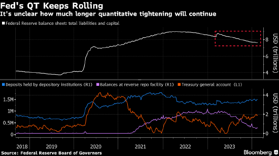 与此同时,最新数据显示,美联储资产负债表上另一大负债——银行的准备金余额为3.54万亿美元。这高于美联储2022年6月开始缩表时的水平。美联储的缩表进程也被称为量化紧缩(QT)。