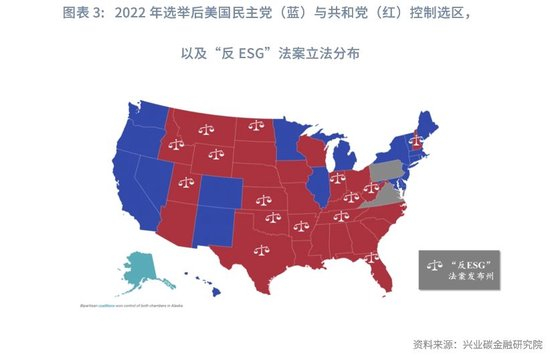 ESG沦为美国党派之争的工具,早已不是什么秘密[5]。事实上,美共和党派一直试图通过一系列立法以阻止ESG发展:截至2023年,美国有15个州已经通过并实施“反ESG”法案,旨在限制投资和商业决策中使用ESG因素。可以发现,“反ESG”法案立法州分布与共和党控制选区高度一致。