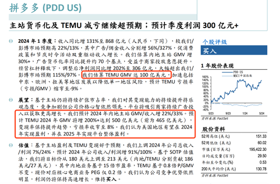 按照2020-2022年的复合增长率48%粗略测算,到今年一季度,拼多多海外业务的营收可能超过300亿,同比实现近12倍的增长。交银国际报告显示,第一季度Temu商品成交额达100亿美元,预计亏损率缩窄至9%。其在美国地区有望在2024年实现盈利,并在2025年实现平台整体盈利。