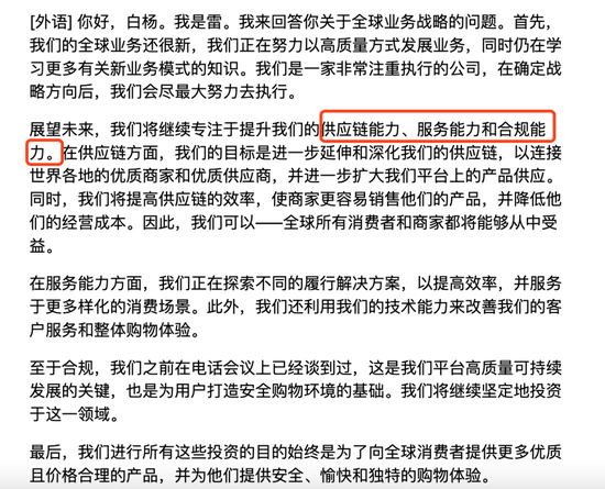 在介绍全球业务战略时,他表示,未来公司将在供应链、服务能力以及合规能力三个方面持续发力。