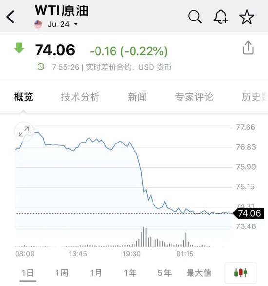 最终,WTI 7月原油期货收跌2.77美元,跌幅近3.60%,报74.22美元/桶,刷新2月7日以来收盘低位;布伦特8月原油期货收跌2.75美元,跌幅为3.39%,报78.36美元/桶,刷新2月5日以来收盘低位。