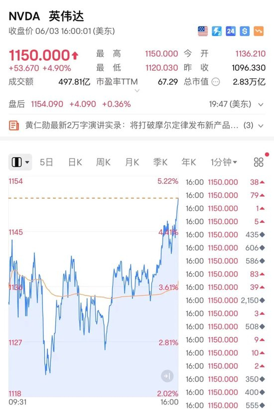 美东时间6月3日,AI龙头英伟达涨近5%,再创历史收盘新高,报1150美元,最新总市值达2.83万亿美元,市值一夜大涨超1300亿美元(约合人民币9600亿元)。