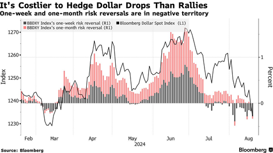 一篮子美元主要贸易伙伴的货币对风险逆转指数显示,交易员为在未来一周或一个月内美元下跌时受益的期权支付的价格高于那些寻求上涨的期权。