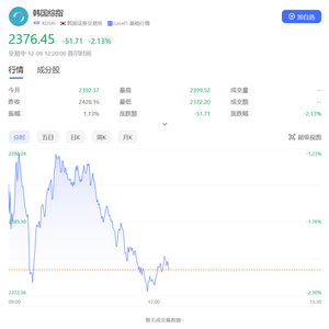 12月9日(周一)早盘,韩国金融市场再度动荡。韩国首尔综指跌幅一度扩大至2.23%,截至发稿跌2.13%。