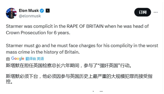 马斯克在24小时内,发布或转发40多篇关于英国罗瑟勒姆镇多名女童遭性侵的帖文。该案于2013年曝光,疑犯被指多是当地南亚裔男子。马斯克声称时任英国皇家检察署刑事检控专员的斯塔默,在该案中未能将移民强奸团伙绳之以法,马斯克表示,“斯塔默是英国强奸案的同谋,他必须下台,因参与英国历史上最严重的大规模犯罪而受指控”。