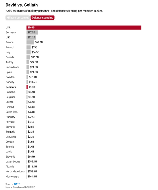 因为很简单,美国去年军费9680亿美元,丹麦是99亿,两则的实力差距,仿佛神话中“大卫对战巨人歌利亚”。