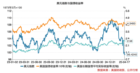 当前,美元王座也开始摇晃,美元作为全球储备货币的地位正面临历史性挑战。达利欧指出,美国国债抛售和美元贬值是市场对美元信心的直接反映。自2025年4月1日至4月14日期间,美元指数已经从104.2263下跌到了99.6920(1973年3月=100),累计跌幅达4.35%,一度跌破100关口,为2023年7月以来首次。4月11日,美国长期国债平均实际收益率达到了2.66%,是2009年4月份以来的最高点。这些都反映出了市场对美元长期稳定性的担忧。部分国家可能会减少美元资产配置,转向黄金、欧元或区域性货币结算体系。