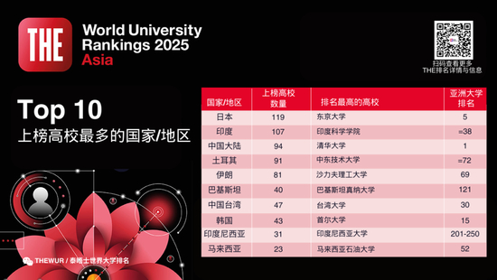 中国大陆共有94所高校上榜,是上榜高校数量排在第三国家/地区,仅次于日本(119所)和印度(107所)。中国大陆有25所高校创下了史上最佳表现,28所高校的排名较去年有所提升。