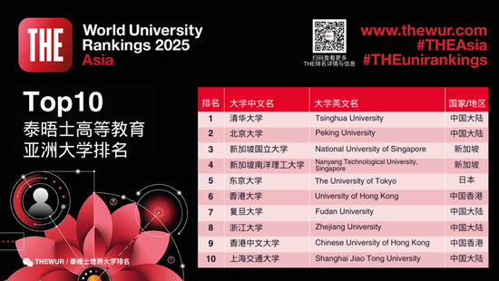 排名揭晓|2025年度泰晤士高等教育亚洲大学排名: 中国大陆高校领跑亚洲大学排名 清华蝉联榜首 北大稳居第二