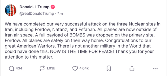 当地时间6月21日,美国总统特朗普在其社交媒体“真实社交”上发文称,美国已完成对伊朗福尔多、纳坦兹和伊斯法罕三处核设施的袭击。