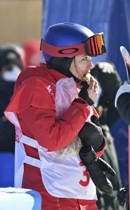 在北京2022年冬奥会自由式滑雪女子坡面障碍技巧资格赛中,中国选手谷爱凌在等待裁判打分时吃韭菜盒子。新华社记者 郭程 摄