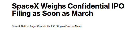 彭博引述知情人士透露,马斯克(Elon Musk)旗下太空探索技术公司SpaceX考虑最早在3月保密提交IPO文件,以推进史上最大规模的上市计划。