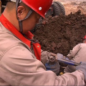 吴连山:慢点慢点,千万慢点,别磕脑袋。你们从不钻地,我们常钻没事,习惯了就知道了。