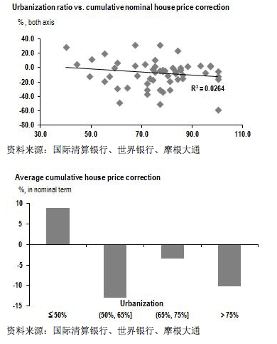 这方面证据并不令人信服。如下图所示,乍一看,房价修正幅度与城市化率(在房市繁荣的高峰年)没有关联。