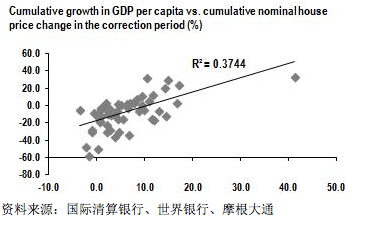 经验观察似乎证明了这一点。收入(使用人均GDP来衡量)增长与修正期的房价变动显著相关。收入增长较快的国家, 其房价在调整期下跌幅度较小。在我们的样本中,收入增长为负数(或持平)的国家房价下跌最严重。