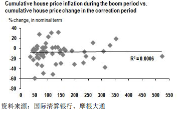 第二,如下图所示,房价修正幅度与繁荣时期房价的涨幅无关联。