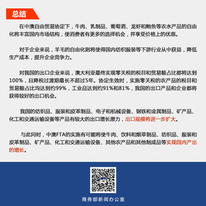 综上所述,在中澳自由贸易协定下,牛肉、乳制品、葡萄酒、龙虾和鲍鱼等农水产品的自由化将丰富国内市场结构,使消费者有更多的选择机会,并享受价格上的优惠。