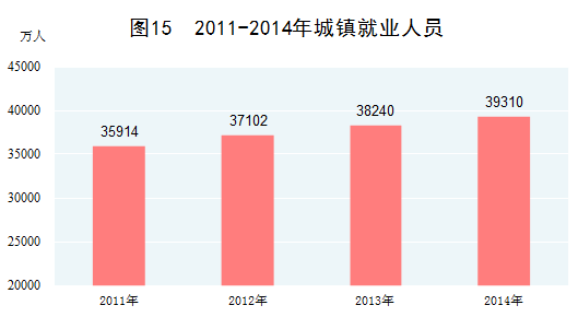 就业稳步增加。高度重视就业工作,以改革促进大众创业、万众创新,在经济增速放缓的背景下就业总量不降反升。 2014 年末,全国就业人员达到 77253 万人,比 2010 年末增加 1148 万人。其中,城镇就业人员增加到 39310 万人,占全部就业人员的比重为 50.9% ,比 2010 年末提高 5.3 个百分点。 2014 年农民工总量为 27395 万人,比 2010 年增长 13.1% ,年均增长 3.1% 。 2015 年上半年新增就业 718 万人,完成全年目标的 71.8% 。