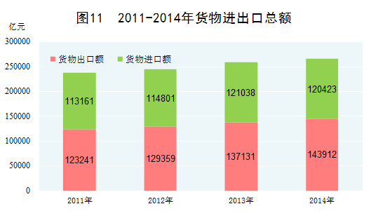 进出口贸易规模稳步扩大。尽管国际金融危机以来世界经济复苏步履蹒跚,但由于党中央国务院积极应对,我国进出口贸易总体上保持了稳定增长,占国际贸易的份额继续上升。 2014 年,我国货物进出口总额达到 26.4 万亿元,居世界第一位,比 2010 年增长 31.0% ,年均增长 7.0% 。货物进出口总额占世界贸易总额的比重为 11.3% ,比 2010 年提高 1.7 个百分点。