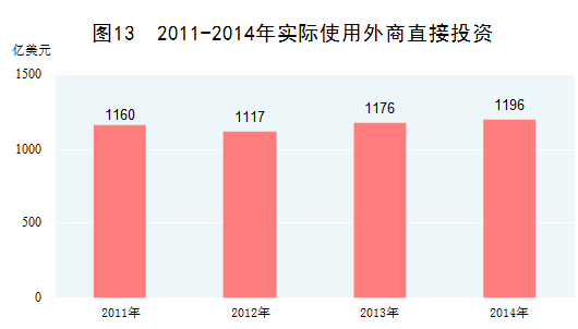利用外资规模跃居世界第一。利用外资从追求量的扩大转向质的提高。 2011-2014 年,我国累计实际使用外商直接投资 4649 亿美元,年均增长 3.1% ,其中, 2014 年实际使用外商直接投资 1196 亿美元,首次跃居全球第一。外商投资领域也从一般制造业向高技术产业和金融、保险等服务业拓展。