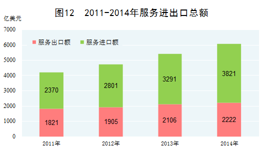 服务贸易取得长足发展。 2014 年,服务进出口总额达到 6043 亿美元,比 2010 年增长 66.7% ,年均增长 13.6% 。服务贸易结构逐步优化,计算机、保险、金融、咨询等高附加值服务贸易出口增长势头强劲。
