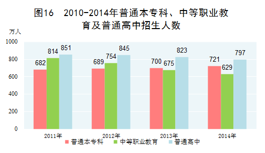 教育事业成绩显著。 2014 年,小学学龄儿童净入学率达到 99.8% ;中等职业教育招生 629 万人,在校生 1803 万人,毕业生 633 万人;全国普通本专科招生 721 万人,在校生 2548 万人,毕业生 659 万人,分别比 2010 年增加 60 万人、 316 万人、 84 万人;高等教育毛入学率达到 37.5% ,比 2010 年提高 11 个百分点。