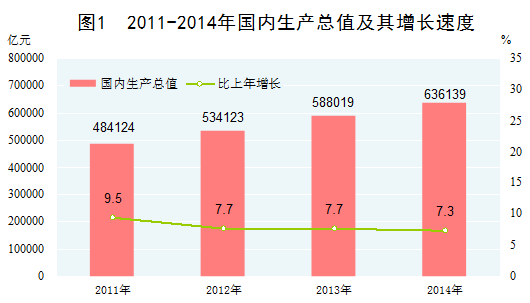 经济增长保持中高速。 2011-2014 年,国内生产总值年均增长 8.0% ,由高速增长转为中高速增长。分年度看, 2011 年比上年增长 9.5% , 2012 、 2013 年均增长 7.7% , 2014 年增长 7.3% , 2015 年上半年增长 7.0% 。“十二五”期间,预计我国经济年均增长近 8% ,不仅高于同期世界 2.5% 左右的年均增速,在世界主要经济体中也名列前茅。