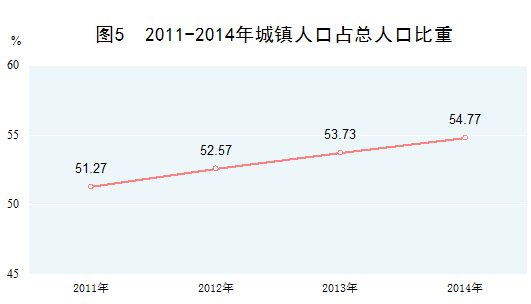 新型城镇化稳步推进。 2011 年末,城镇人口首次超过农村人口,城镇化率突破 50% , 2014 年进一步提高到 54.77% , 2011-2014 年城镇人口每年增加近 2000 万人,带动了巨大的投资和消费需求。与此同时,稳步推进农民工市民化,我国城镇化不仅有量的扩大,更有质的提升。