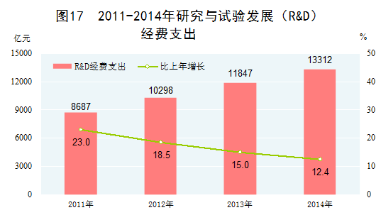 科技事业成果丰硕。 2014 年,研究与试验发展( R&D )经费支出 13312 亿元,比 2010 年增长 88.5% ,占国内生产总值的比重为 2.09% ,比 2010 年提高 0.36 个百分点。专利申请量和授权量大幅增加。 2014 年,受理境内外专利申请 236 万件,授予专利权 130 万件,分别比 2010 年增长 93.2% 和 59.9% 。基础研究和前沿技术研究取得一批重大成果,探月工程、载人深潜、卫星应用、超级计算等重大科研项目取得新突破,为产业转型升级提供了强有力的技术支撑。