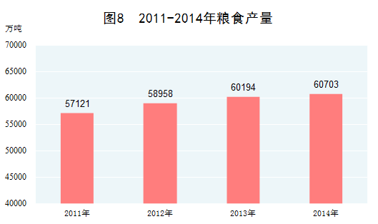 农业基础进一步巩固。 2014 年,粮食总产量取得历史性突破,达到 60703 万吨,比 2010 年增长 11.1% ,年均增长 2.7% ,实现“十一连增”。近年来,我国谷物、肉类、籽棉、花生、茶叶、水果等农产品产量稳居世界第一位。
