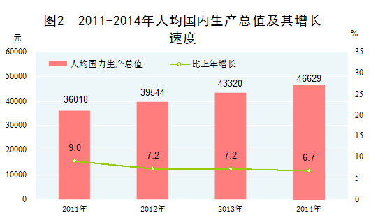 人均国内生产总值稳步提高。 2014 年,我国人均国内生产总值 46629 元,扣除价格因素,比 2010 年增长 33.6% ,年均实际增长 7.5% 。根据世界银行数据,我国人均国民总收入由 2010 年的 4300 美元提高至 2014 年的 7380 美元,在上中等收入国家中的位次不断提高。