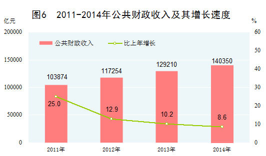 国家财政实力明显增强。 2011 年,我国公共财政收入突破 10 万亿元大关, 2014 年超过 14 万亿元,比 2010 年增长 68.9% ,年均增长 14.0% 。随着国家财政实力增强,财政对经济社会发展的支持不断加大。 2014 年,我国公共财政支出超过 15 万亿元,比 2010 年增长 68.7% 。重点领域民生支出得到较好保障。 2011-2014 年,城乡社区事务、医疗卫生、交通运输、教育、社会保障和就业支出年均分别增长 21.1% 、 20.4% 、 17.2% 、 16.2% 和 14.9% 。