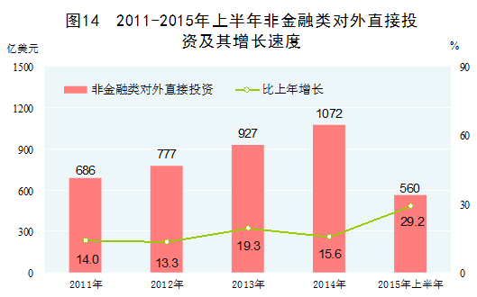 “走出去”战略加快实施。对外投资进入加速发展阶段,沿海开放、沿边开放展现新格局。 2014 年,非金融类对外直接投资 1072 亿美元,比 2010 年增长 78.1% ,年均增长 15.5% , 2015 年上半年非金融类对外直接投资同比增长 29.2% 。 2014 年,对外承包工程业务完成营业额 1424 亿美元,比 2010 年增长 54.5% ,年均增长 11.5% 。自贸区建设取得重要突破, 2013 年我国在上海设立了首个自由贸易园区,此后又新设广东、天津、福建自由贸易园区;与冰岛、瑞士自贸区启动实施,中韩、中澳自贸区完成实质性谈判。积极推进丝绸之路经济带和 21 世纪海上丝绸之路合作建设,参与境外基础设施建设和产能合作,在铁路、电力、通信、油气等领域对外合作取得重要成果。