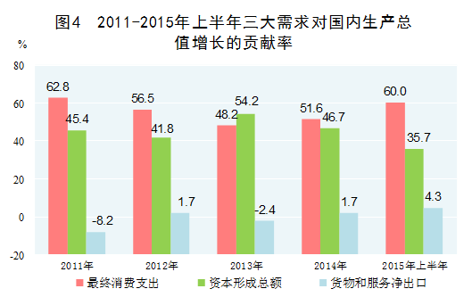 内需特别是消费对经济增长贡献明显增强。在扩大内需战略的带动下,消费的基础性作用和投资的关键性作用得到较好发挥,特别是消费结构升级带动居民消费潜力有序释放,消费成为拉动经济增长的主动力。 2011-2014 年,最终消费对经济增长的年均贡献率为 54.8% ,高于投资贡献率 7.8 个百分点。 2015 年上半年,消费对经济增长的贡献率上升为 60% 。