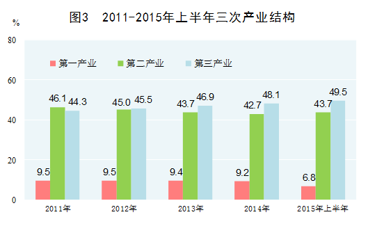 服务业成为第一大产业。随着我国经济发展水平的提高,对生产性和生活性服务的需求不断扩大,服务业在国民经济中的地位上升。 2012 年,我国第三产业现价增加值占国内生产总值的比重上升到 45.5% ,首次超过第二产业成为国民经济第一大产业。 2014 年,第三产业比重上升到 48.1% ,比 2010 年提高 3.9 个百分点, 2015 年上半年进一步上升到 49.5% 。