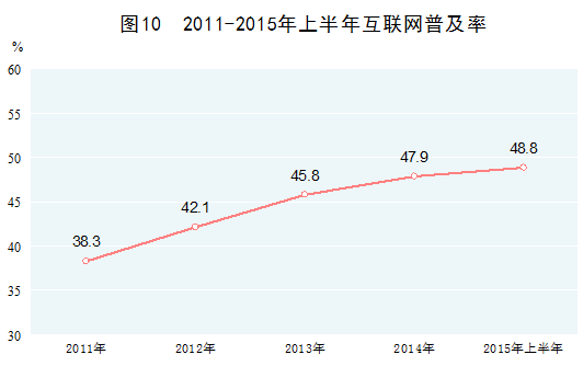 信息通信发展水平快速提高。 2014 年,我国邮电业务总量 21846 亿元(按 2010 年不变价格计算),比 2010 年增长 90.4% ,年均增长 17.5% 。移动互联网产业方兴未艾,“宽带中国”战略加快实施。 2014 年末,移动电话用户、互联网上网人数分别达到 12.9 亿户、 6.5 亿人,分别比 2010 年增长 49.7% 、 41.9% ;移动电话普及率、互联网普及率分别达到 94.5 部 / 百人、 47.9% ,分别比 2010 年提高 30.1 部 / 百人、 13.6 个百分点。