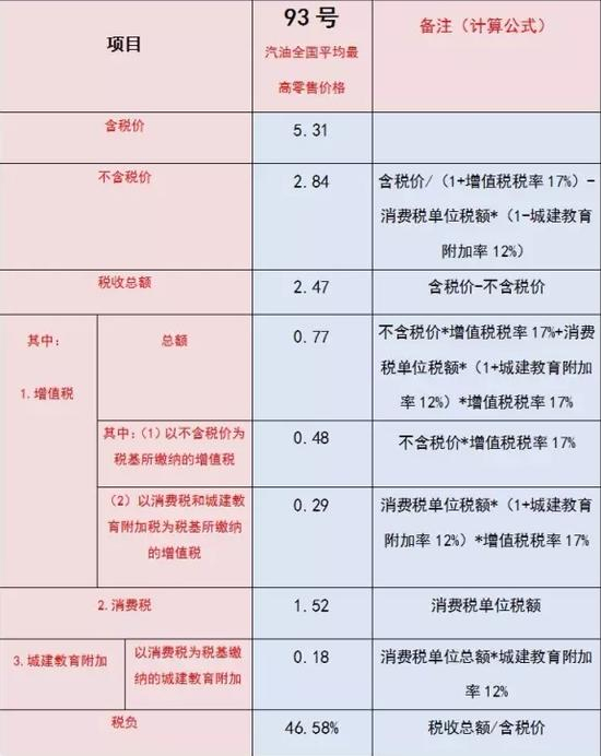 对于小编这个文科生来说,这是个很烧脑的公式。总的来说包括两个部分,一部分是以不含税价为税基所缴纳的增值税。目前一升汽油的不含税价是2.84元,也就是2.84(不含税价)×17%(增值税税率)=0.48元。另一部分是以消费税和城建教育附加为税基所缴纳的增值税,而城建教育附加费是消费税单位税额的12%,因此公式是1.52(消费税)×(1+12%)×17%=0.29元。