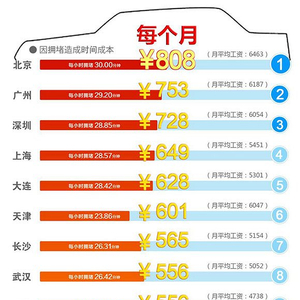 根据高德地图发布的《2015年第三季度中国主要城市交通分析报告》,北京通勤族高峰每出行1小时,就有30分钟耗费在严重堵车上。如果参照社保部门最近公布的上年度平均工资,将时间换算成金钱的话,北京上班族每月的通勤成本最高,光因拥堵造成的时间成本就有808元(按每月22个工作日,每天通勤2小时计算)。而这已经足够弥补市区和远郊的价格差。