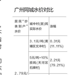 调研报告还披露了一个怪现象:同城不同价,村改居社区到户水价较高。以广州市受访的9个城中村为例,有6个城中村的实际水价高于5元/吨,涨幅8- 9成。最高的是荔湾区坦尾村,10元/吨,涨价7 .21元,涨幅258 .42%。