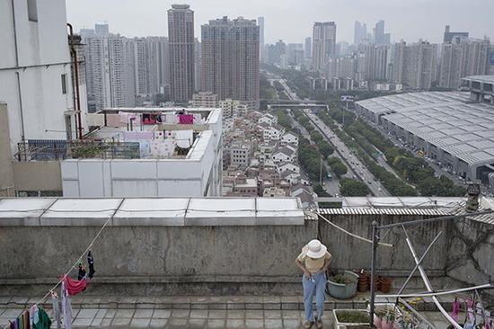 2016年4月3日,深圳市福田区一栋高层住宅楼的露台,一位住户正在打理她种植的葱苗,远处的矮房子是一个名为皇岗的城中村,和高层电梯楼相比,同样面积的房子租价往往只有一半左右。