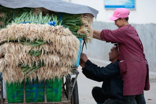 2016年4月9日,曹安公路边上的江桥星火村。一对居住于此的外来打工夫妇准备将大蒜销售到市场。
