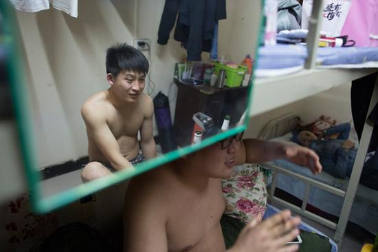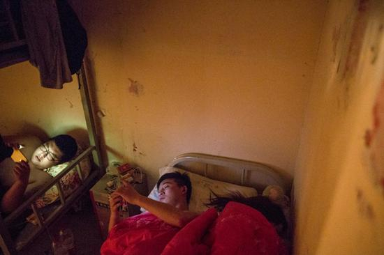 2016年4月10日,北京,由于当天宵夜太晚,周文才与妻子挤在宿舍单人床上凑合一夜。