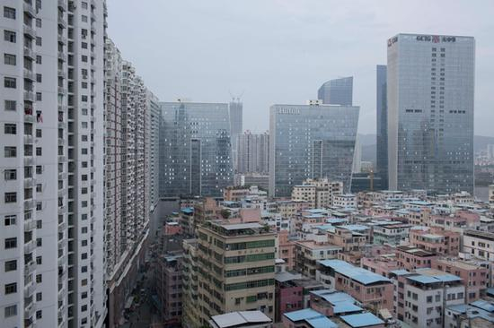 2016年4月3日,深圳市福田区,高楼大厦与皇岗村毗邻,这里是深圳最繁华的区域之一,许多人白天在写字楼上班,晚上回城中村的出租屋休息。