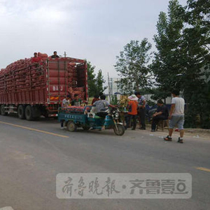 26日下午,在商河县白桥镇亓家官庄村,不少大车停在村头收大蒜。齐鲁壹点 记者王皇摄