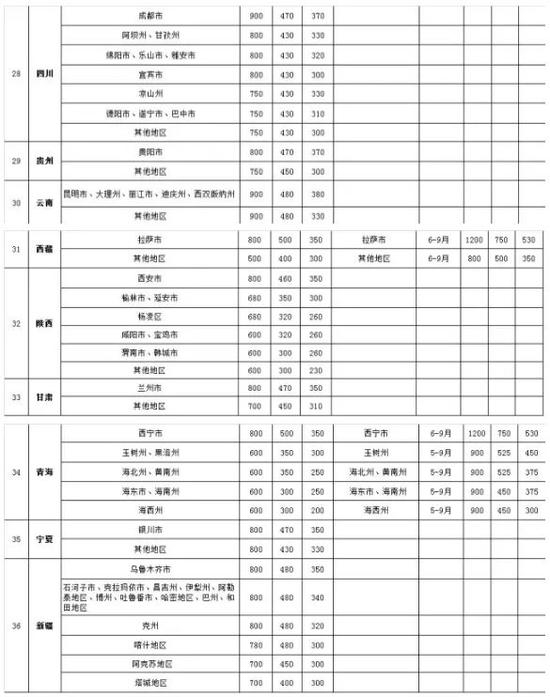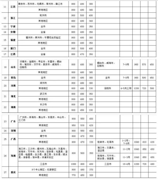 《明细表》根据城市的特点也实行淡旺季之分。据统计,实行旺季浮动地区有张家口市、秦皇岛市、承德市、海拉尔市、满洲里市、阿尔山市、二连浩特市、额济纳旗、大连市、哈尔滨市、牡丹江市、伊春市、大兴安岭地区、漠河市、佳木斯市、烟台、洛阳、威海、青岛等40个地区。根据每个地区的气候特点,其旺季期间起始时间也不一样,旺季月数多在3至4个月。其中,张家口市的旺季时间最长为8个月,旺季浮动价部级每人每天1200元,浮动率达到50%。