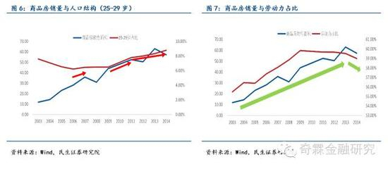 从我国2003-2014年的数据可见,25-29岁年龄段的人口占比与商品房销售面积大体上是保持一致的,在人口占比上升的阶段,商品房销售也快速增长。同时,劳动力数量的占比变化的大体趋势也与商品房销量变化趋势相吻合。