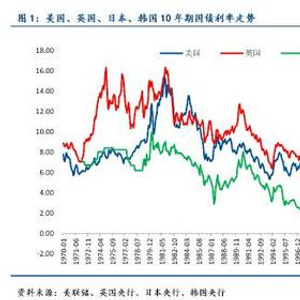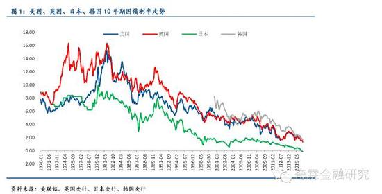 二十世纪80年代起,美国、英国、日本和韩国等发达国家的利率开始进入下行周期,债券市场步入长期大牛市。就10年期国债收益率来看,美国在1981年10月达到最高峰15.15%,之后一路下行,截至今年7月7日跌至1.35%。英国从1974年到1981年都保持超过10%的高收益率水平,1981年11月达到峰值15.72%后一路震荡下行,到今年7月4日降至0.98%的低位。日本10年期国债收益率同样在1980年4月达到10%高位后持续下行,中间虽在90年代经济泡沫破裂前有所反复,但难挡下行趋势,今年初宣布实行负利率后,目前10年期国债收益率已到-0.26%。韩国政府2000年10月第一次发行10年期国债,收益率6.56%,到今年6月收于1.62%;而从韩国的存款利率看,利率水平从1980年的19.5%下降到今年5月的1.54%。