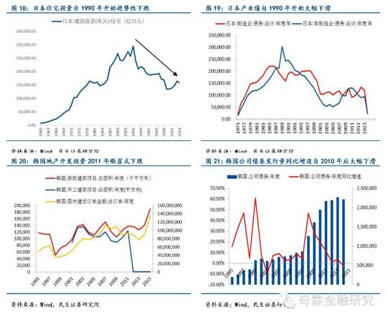 从日本和韩国的经验来看,首先日本建筑投资自20世纪90年代初开始趋势性下跌,同比增速从1990年的12.52%大幅下跌至-2.9%,此后同比跌幅不断扩大,直至2004年稍显好转;从债券发行量来看,90年代开始大幅下跌,2000年以后发行量小幅震荡;韩国房地产投资2011年开始下滑,虽获批建筑项目面积在政府刺激下小幅上升,但真正新开工项目面积自2011年始断崖式下跌;相应的公司债券发行量同比增速自2010年起快速下降,从2010年的46.77%下跌至2013年1.01%,再到2015年的-2.5%。